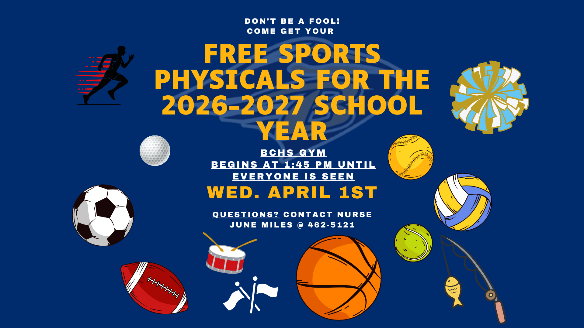 1:30pm Free Sports Physicals in gym for upcoming 9th - 12th graders